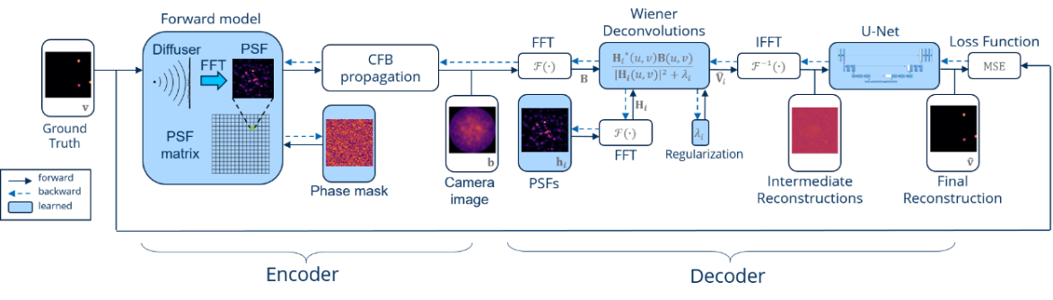 Furthermore, the optical system can be optimized in conjunction with a decoding physics-informed neural network in an end-to-end training approach. After finishing the training process, optimized phase masks can be adapted by a spatial light modulator to validate it and characterize the imaging system. Moreover, recent neural network architectures based on attention are implemented for image reconstruction tasks and can be combined with spatially-varying deconvolution by Wiener filters.